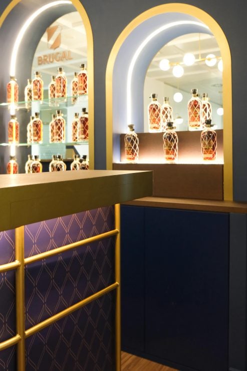 El uso del arco de medio punto ha sido un elemento que hemos repetido en todo el espacio haciendo un guiño a la arquitectura colonial caribeña así como elementos de mármol, revestimientos de maderas oscuras como el palisandro caribeño contrastando con el azul brugal que inunda el espacio junto con la trama romboidal característico de su diseño de marca y el uso de gran cantidad de vegetación tropical que aporta frescura al espacio.